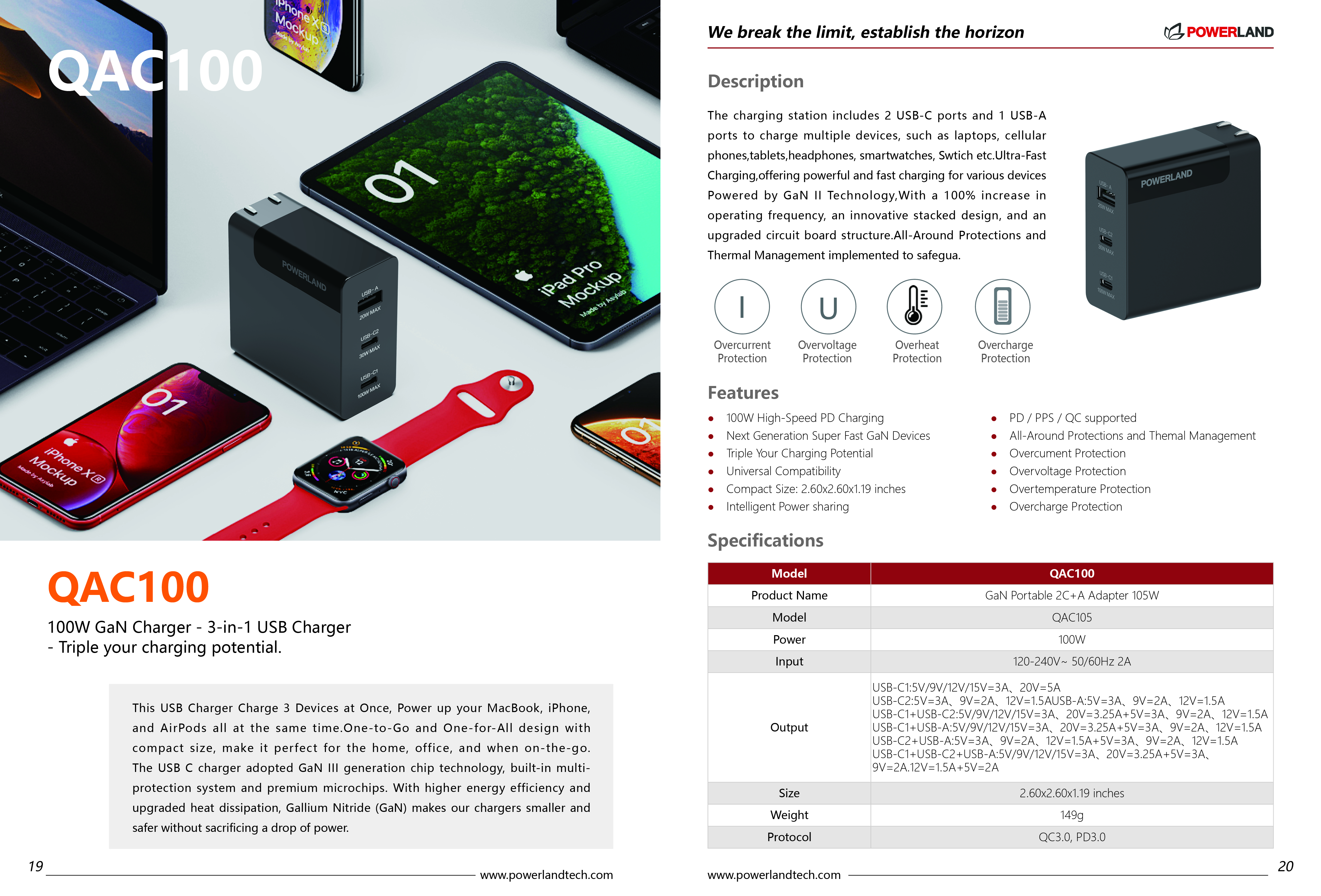Revolutionary Gallium Nitride GaN II Technology is employed in POWERLAND QC65A, enabling high power in a super small space, with 94% power efficiency and provides enough power to charge most flagship notebooks at high speed. All-Around Protections and Thermal Management implemented to safeguard your devices One-to-Go and One-for-All design with compact size, make it perfect for the home, office, and when on-the-go.