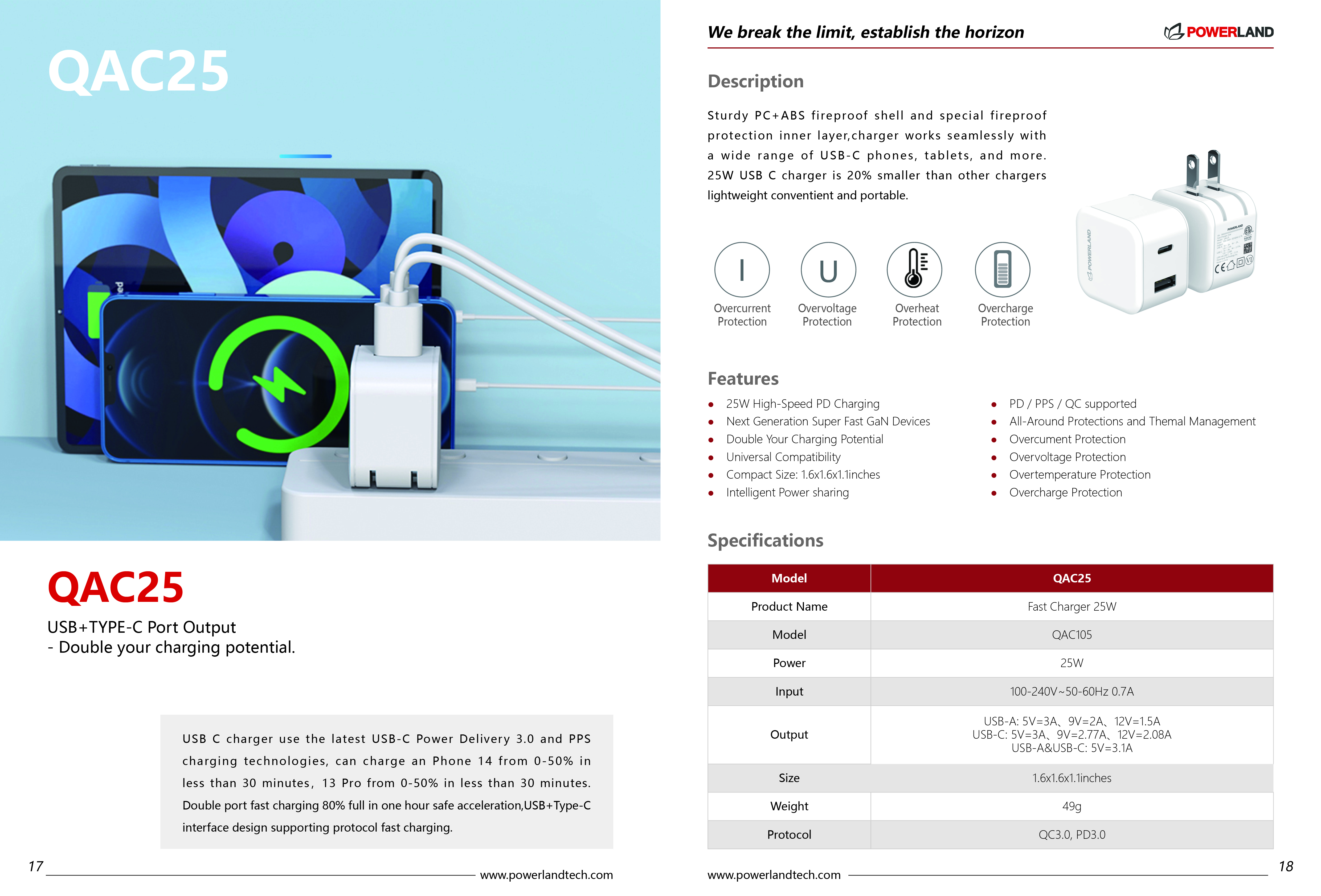 This charger features a sturdy PC+ABS fire-resistant shell and a special fire-resistant protective inner layer, allowing it to seamlessly connect with various USB-C phones, tablets, and more. The 25W USB-C charger is 20% smaller than other chargers, lightweight, and easy to carry. Dual port fast charging, safe acceleration of 80% full charge within one hour, USB+Type-C interface design supports protocol fast charging.