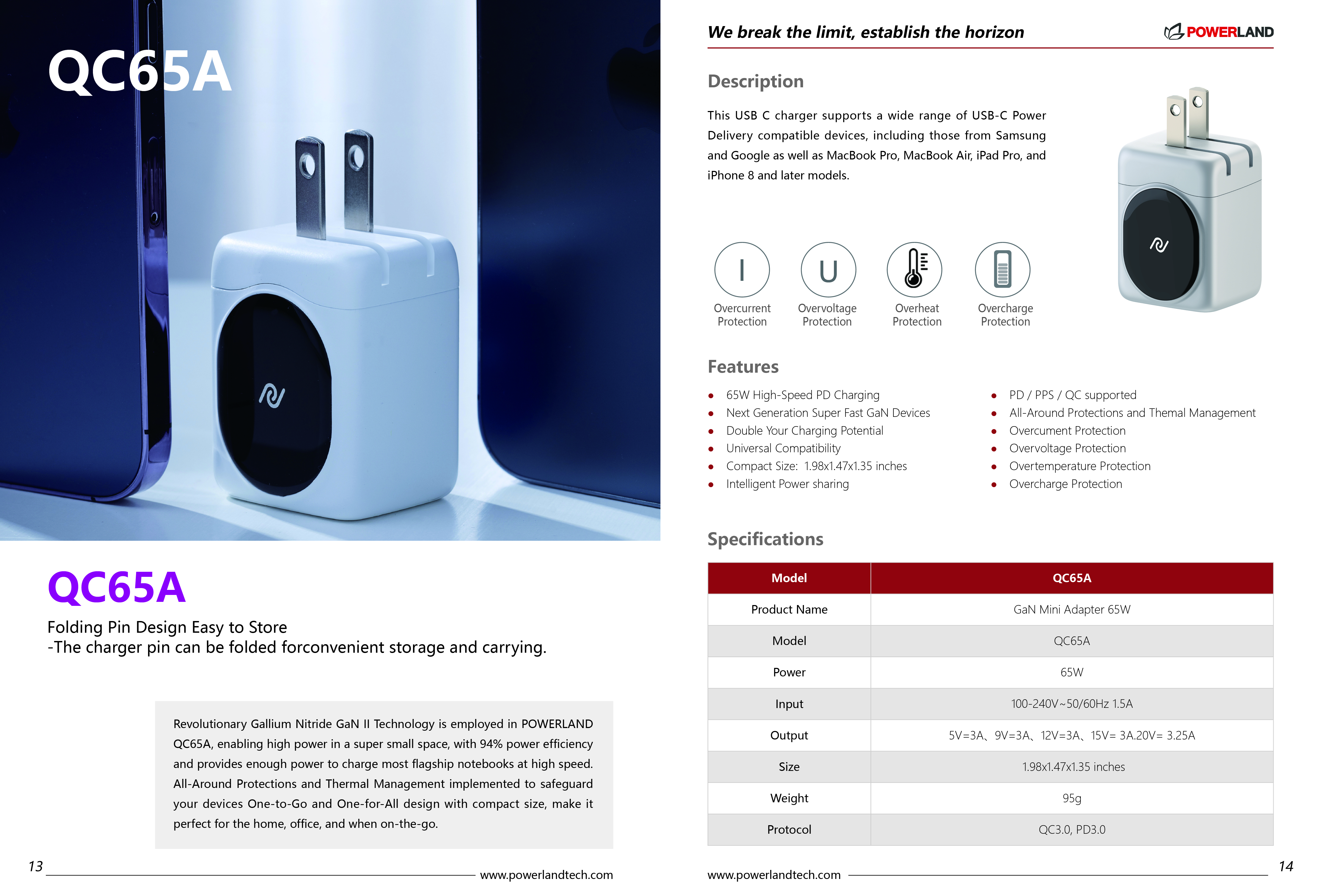 Revolutionary Gallium Nitride GaN II Technology is employed in POWERLAND QC65A, enabling high power in a super small space, with 94% power efficiency and provides enough power to charge most flagship notebooks at high speed. All-Around Protections and Thermal Management implemented to safeguard your devices One-to-Go and One-for-All design with compact size, make it perfect for the home, office, and when on-the-go.